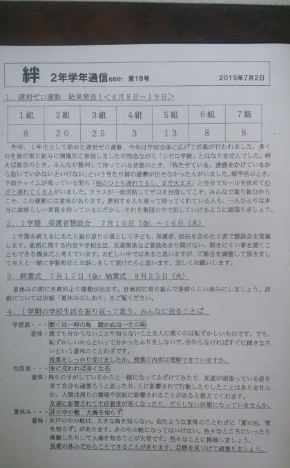 2年生の学年通信「絆」第18号をホームページに掲載します。7月、8月の2年生の行事予定が書かれています。どうぞ、ご覧ください。