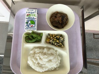 マーボーなす・チンゲンサイとコーンのいためもの・えだまめ・ごはん・牛乳