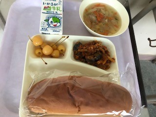 なすのミートグラタン・鶏肉と野菜のスープ・さくらんぼ・パン・牛乳