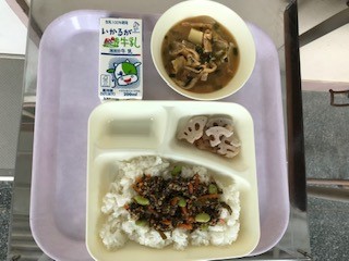 もずくと豚ひき肉のジューシー・さつまいものみそ汁・焼きれんこん・ごはん・牛乳