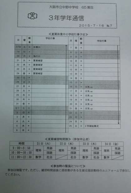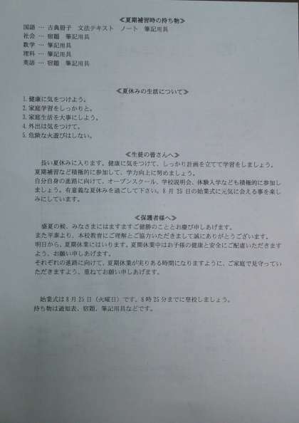 夏休みの補習授業のスケジュール等をお知らせしています。