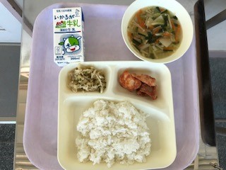 鶏肉のチリソース焼き・焼き豚とワンタンの皮のスープ・切干しだいこんのごま辛みづけ・ごはん・牛乳