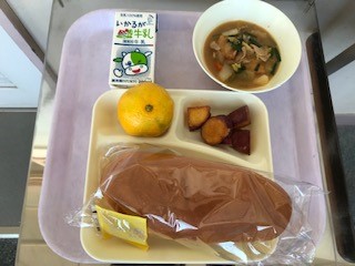 豚肉といかの中華煮・大学いも・みかん・パン・牛乳