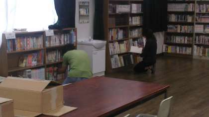 秋の図書室開館を目指して、蔵書の整理をして下さっています。