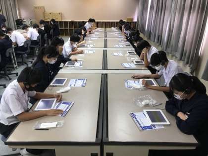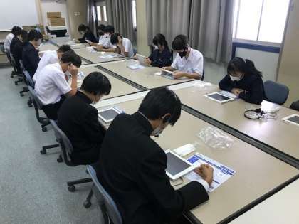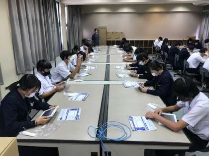 SPEAKINGのテストは各クラス、パソコン室に移動して行われています。コロナ対策のため、、毎時間イヤホンカバー、マイクカバーを取り替え、タブレットの消毒もしています。