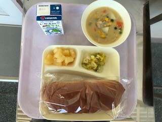 豆乳コーンクリームシチュー・はくさいのピクルス・パインアップル・パン・牛乳