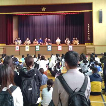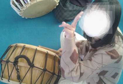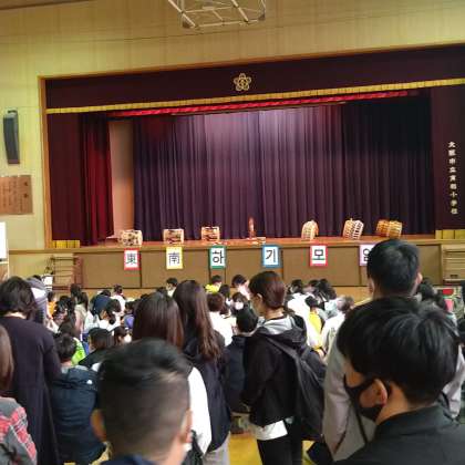 合同サムルノリ(朝鮮の伝統楽器であるケンガリ・ チン・チャング・プクを用いた韓国の現代音楽)の練習風景と本番発表の様子です。