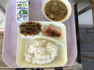 あかうおのしょうゆだれかけ・なめこのみそ汁・きんぴらごぼう・ごはん・牛乳