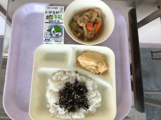 卵どうふ・一口がんもと野菜の煮物・魚ひじきそぼろ・ごはん・牛乳