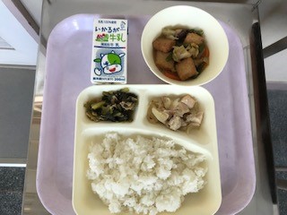 鶏肉のゆず塩焼き・あつあげと野菜の煮物・こまつなの煮びたし・ごはん・牛乳