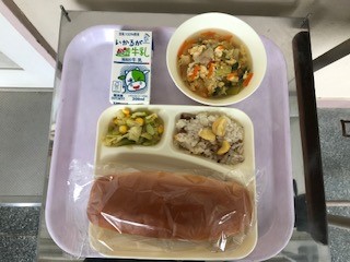 中華おこわ・卵スープ・キャベツのオイスターソース炒め・パン・牛乳