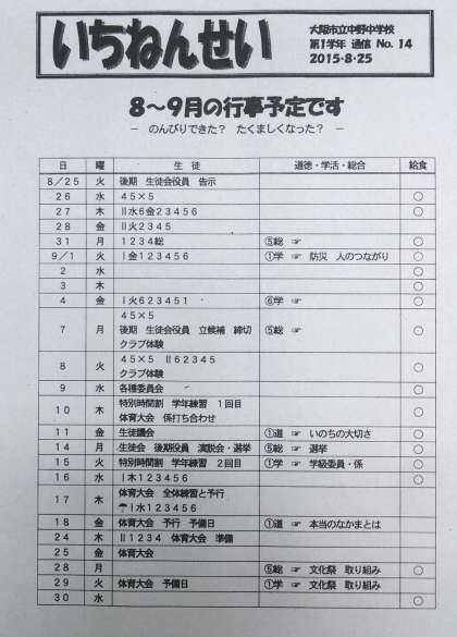 9月は体育大会当日、全体練習の日、体育大会予備日に