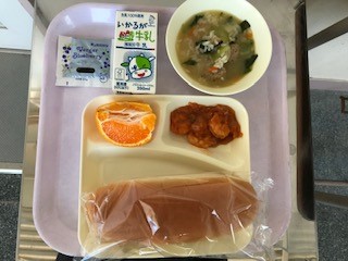 えびのチリソースいため・中華がゆ・デコポン・パン・牛乳