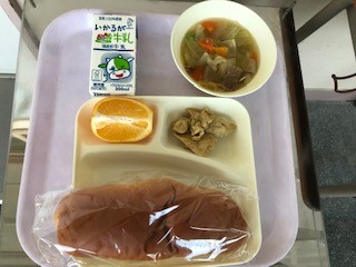 鶏肉のカレー風味焼き・洋風煮・はっさく・パン・牛乳