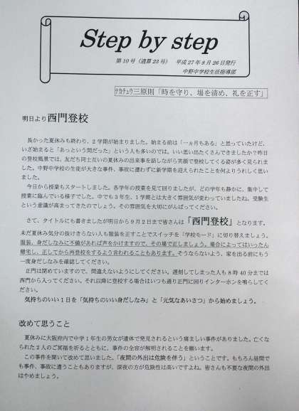 8月26日(水)、生活指導通信「Step by step(第23号)」を発行しました。右下の生活指導通信の「Step by step(第23号)」をクリックしていただきますとご覧いただけます。