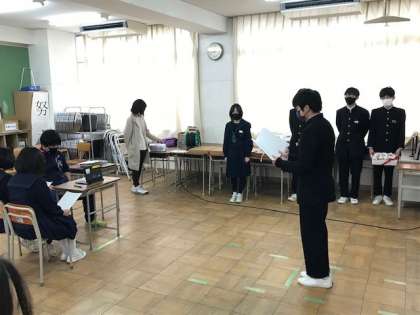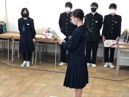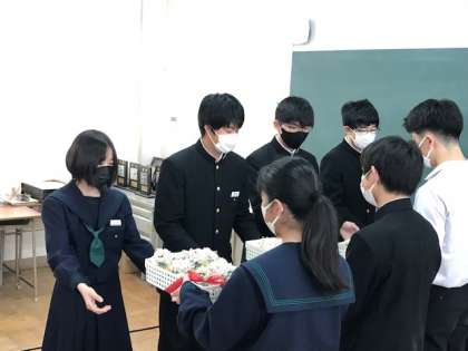 代表生徒のあいさつの後、コサージュが送られました。TEAMS配信にて行われました。