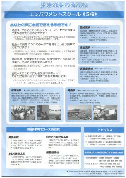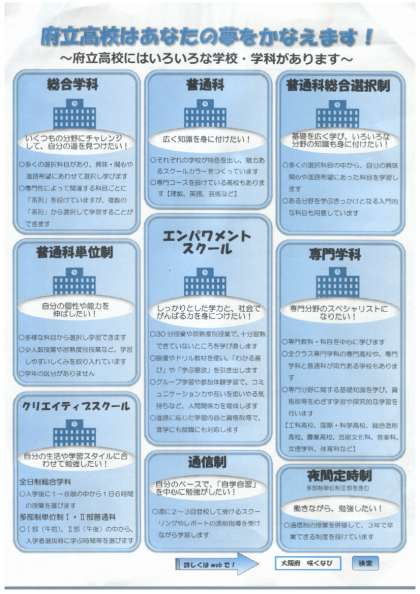 今週、3年生に、「府立高校はあなたの夢をかなえます!」という案内を配布しました。府立高校の種類や、来年度から5校に増えるエンパワーメントスクールの事が記載されています。ご参考にどうぞ。