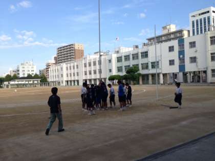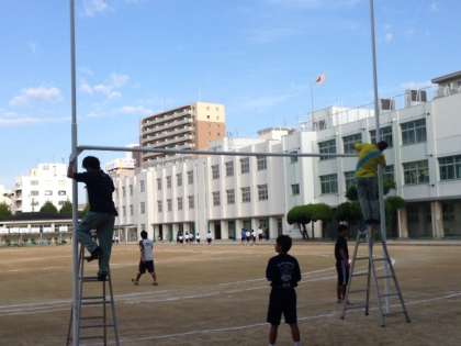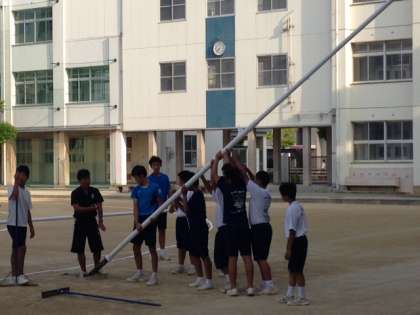 9月15日(火)朝、昨日、修繕・塗装を管理作業員さんに行っていただきましたラグビーポールをラグビー部員の子どもたちが協力して立てました。管理作業員さんにきれいにしていただきましてありがとうございました。ラグビーの練習を頑張ります!