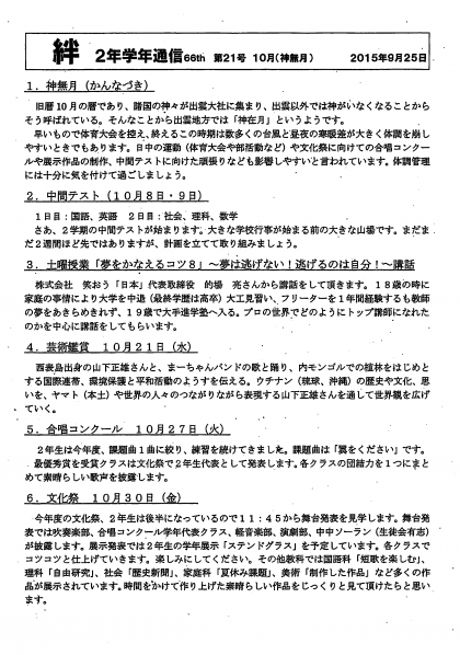 9月25日(金)2年生学年通信「絆」を子どもたちに渡しています。