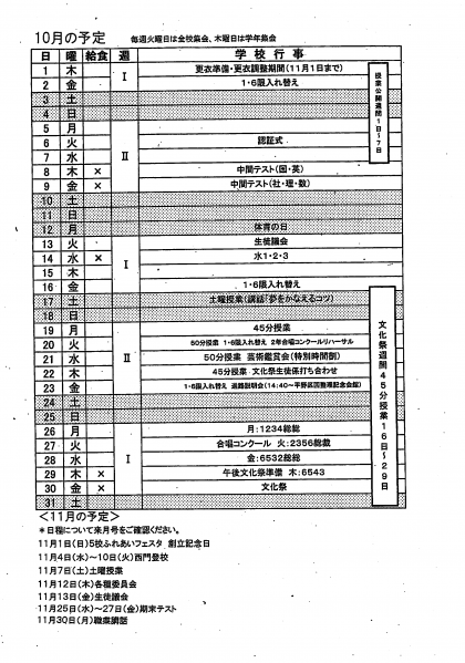 10月は、中間テスト・土曜授業・芸術鑑賞・合唱コンクール・文化祭