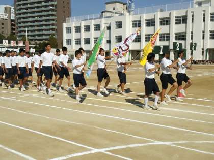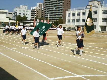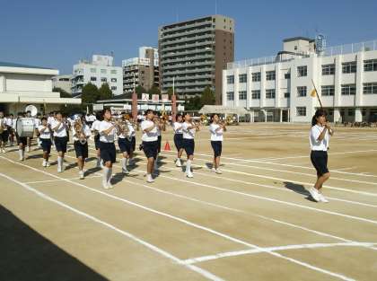 秋晴れの下、第66回体育大会が始まりました。吹奏楽部の演奏で生徒会、3年生,2年生、1年生の順で入場行進を行いました。