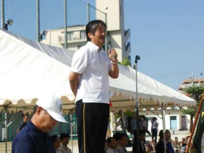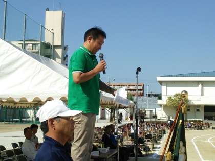 体育大会開会式を行いました。大会会長 山本校長先生、PTA会長 藤秀樹様より子どもたちへお話がありました。そして選手宣誓を行い、いよいよ競技の開始です。