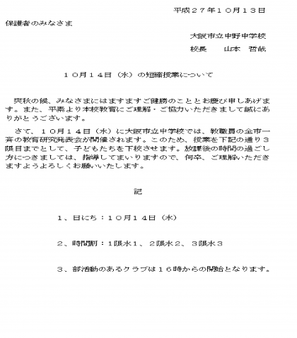 10月14日(水)に大阪市立中学校では、教職員の全市一斉の教育研究発表会が開催されます。このため、授業を下記の通り3限目までとして、子どもたちを下校させます。放課後の時間の過ごし方につきましては、指導してまいりますので、何卒、ご理解いただきますようよろしくお願いいたします。