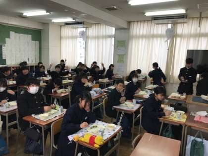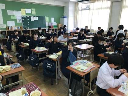 1年生の給食の時間の様子です。今日のメニューは、ちらし寿司と雑煮という正月献立でした。