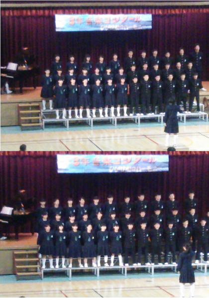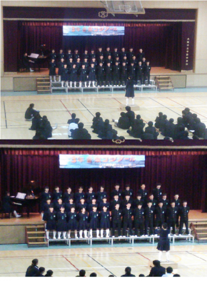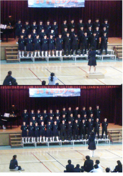 さすが3年生、男子生徒も女子生徒も、大きな声で、そしてきれいなハーモニーで感動の歌声を聞かせてくれました。最優秀賞は1組 優秀賞は6組でしたが、どのクラスも本当によく頑張りました。