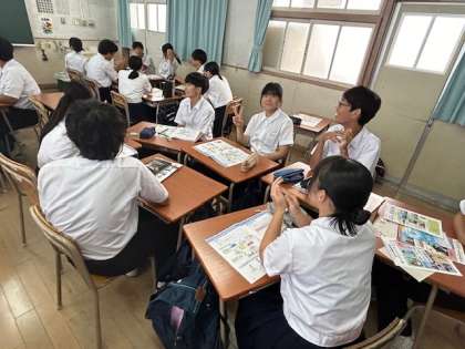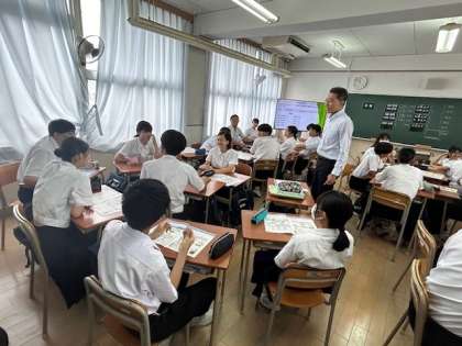 3年生全クラスで、税務署から職員を招いて、税の仕組みなど勉強しました。」写真は3年3組の様子です。