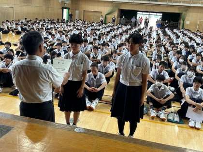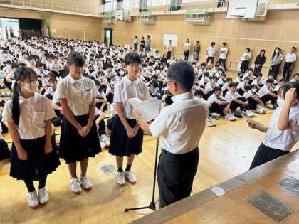 大阪市総体優勝の女子バスケ部と、研究発表で佳作を受賞した理科部の表彰がありました