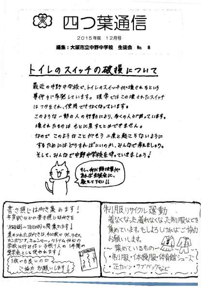 12月4日(金)の生徒保健委員会で、1年生からどうすれば良いかの提案がありました。すると2年・3年生でも、スイッチが壊されて、結局スイッチの所にふたをされて、暗いトイレを使わざるをえなかったり、汚いままであったり、とかトイレットペーパーが丸ごと投げ込まれたりすることもあったという話でした。話し合いの結果、委員長が生徒議会にトイレのスイッチを直してもらうことを提案することになりました。