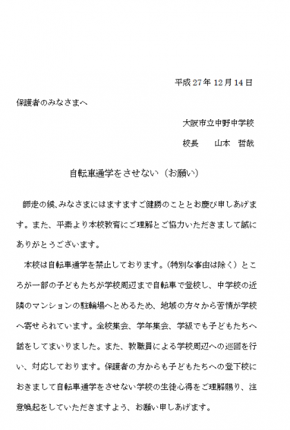 禁止されている自転車通学に対して、保護者のみなさまへのお願いです。
