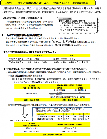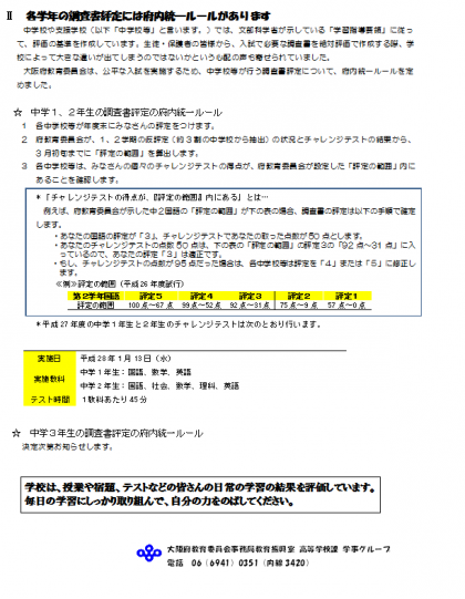 来年実施のチャレンジテストの点数により、個人の評定の範囲が規定され、それが将来の入試の調査書にも影響されますので、内容をぜひお読みください