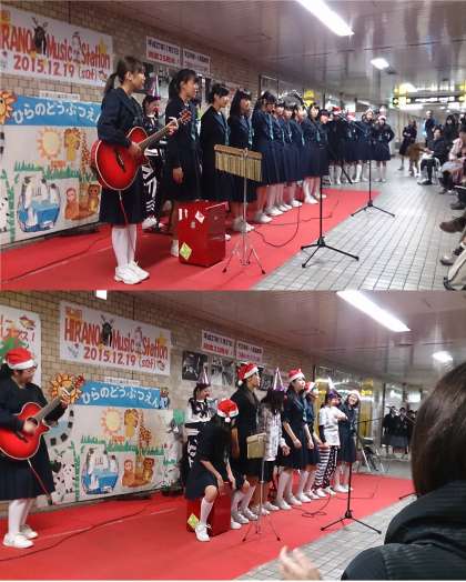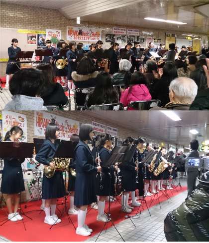 12月19日(土)午後1時より中野中学校吹奏楽部、軽音楽部がHirano Music Station2015に出演しました。地下鉄平野駅の特設ステージで演奏・歌を披露しました。地下鉄平野駅を乗降者の方や保護者のみなさまの熱い応援の中、子どもたちは日頃の練習の成果を発揮しました。
