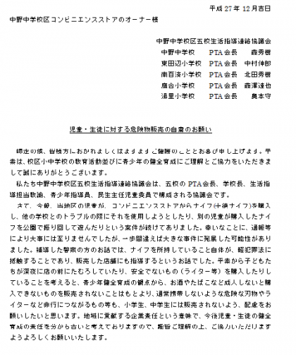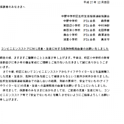 これは今月7日に行われた「五校生活指導連絡協議会」において、コンビニエンスストアが販売した十徳ナイフを校区児童が持ち、遊んでいて補導された事案に対し、ナイフのみならずライターなど好ましくないものの販売自粛をお願いするものです。