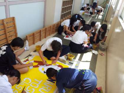 後の体育大会や文化祭で大活躍する学級旗を作っています。