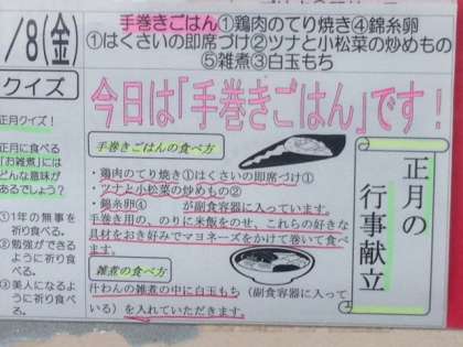 1月8日(金)は、2016年最初の給食でした。今日の献立は、「お正月の行事献立」でした。
