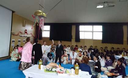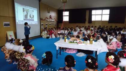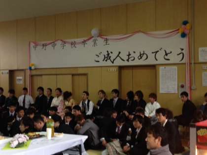 1月11日(月)成人の日・校区4小学校前から新成人を乗せたバスが中学校の武道場へ来て、約200名近くの若人が集まりました。中野中学校の親和会のみなさま・PTA役員のみなさまがみんなを祝福し、当時の校長先生、学年の先生方5名が駆けつけて、成人のお祝いをしました。元気に、学問に、仕事に励んで、頑張ってください。今日は新成人のみなさん、おめでとうございます。