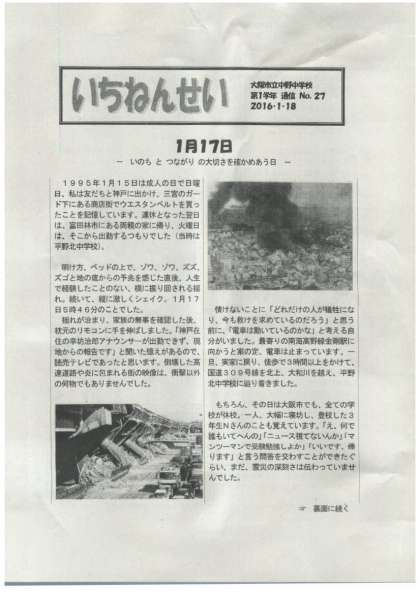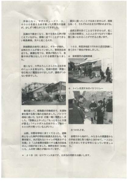 阪神淡路大震災が起きて21年を迎えました。中学生のみんなは阪神淡路大震災を経験していません。マグニチュード7.3、6000名を超える人々の命を奪った大震災の様子をみんなに伝えることで、命の大切さを知り、防災の大切さを改めて学びます。先日、南百済地区の防災訓練においても防災リーダーから何回も訓練することが大切であることを地域のみなさま、子どもたちにお話されていました。