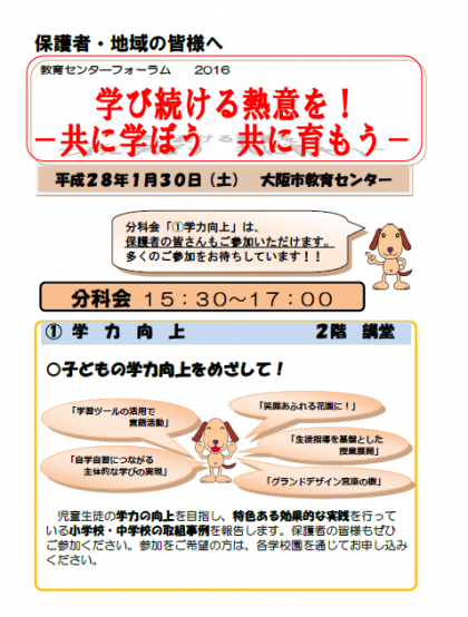 1月30日(土)15:30より、大阪市教育センター(各線弁天町駅徒歩5分)にて、下記の要領で教育フォーラムが行なわれます。保護者の方も参加いただけますので、お時間が合えばどうぞご参加ください。