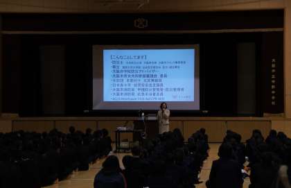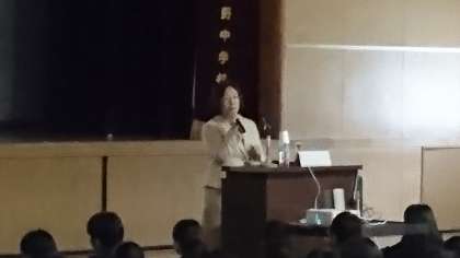 続いて、体育館にて、防災士の坂本真理さんより、防災についてのお話がありました。