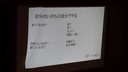 逃げようとしていた時に小学生の男の子が泣いていました、連れて行きますか、そのまま逃げますか?など、いざという時に直面するときの葛藤のお話や、普段からの心構えなどのお話が聞け、とても勉強になりました。