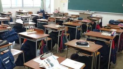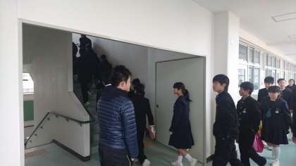 まずは避難訓練、今回は水害想定で教室で待機した後校舎の上部に非難します。