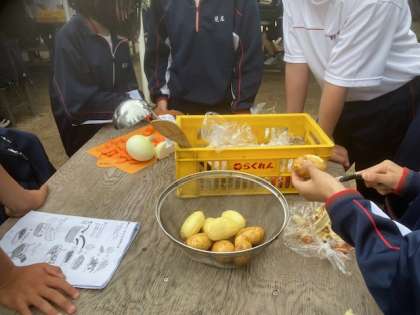 玉ねぎ、にんじん、ジャガイモを細かく、切っています。