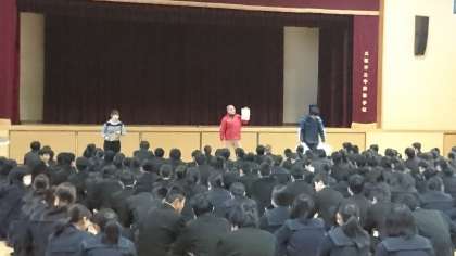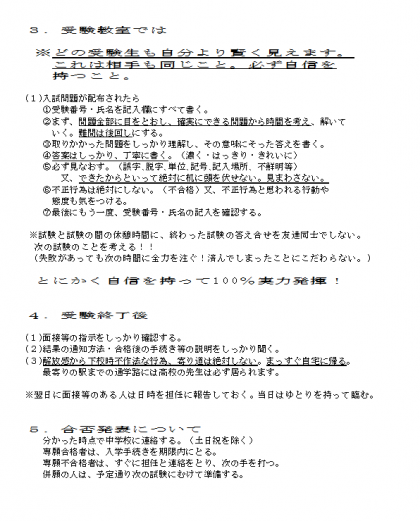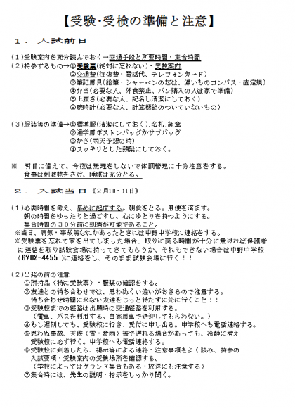2月9日(火)明日、私立高校の入試を受ける生徒も多いので、注意事項を下記プリントを元に話しました。(プリントは右下・『本日の配布物』にも掲載しています)