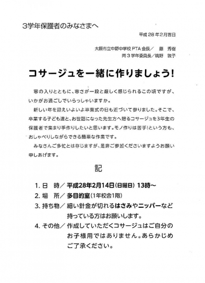多目的室(北館「2年校舎の一階」です)にて、卒業式に子どもたちに贈るコサージュを、3年生の保護者で作りたいと思います。みなさん多忙とは存じますが、ぜひお集まりくださいますようお願いいたします。