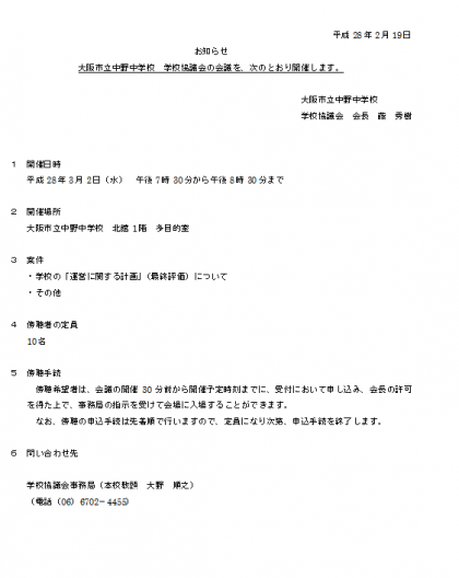 本日 生徒に配布しておりますが、下記の要領で学校協議会が開催されます。