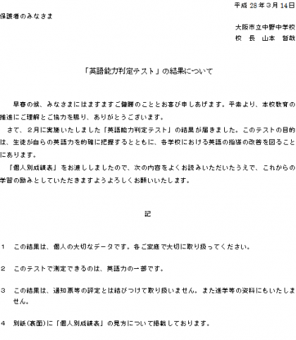 2月2日(火)に行いました英語能力判定テストの結果を本日、子どもたちに返しました。結果をもとに現在の英語力を把握していただけたらと考えています。配布したプリントも併せてご覧いただきますようによろしくお願いいたします。