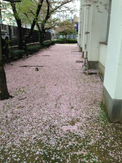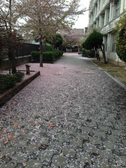 4月8日(金)の朝、いよいよ新年度のスタートです。昨日の風雨で桜の花が散ってしまいましたが、桜の花のじゅうたんのようにきれいに花びらが積もって、全校生徒を温かく迎えます。